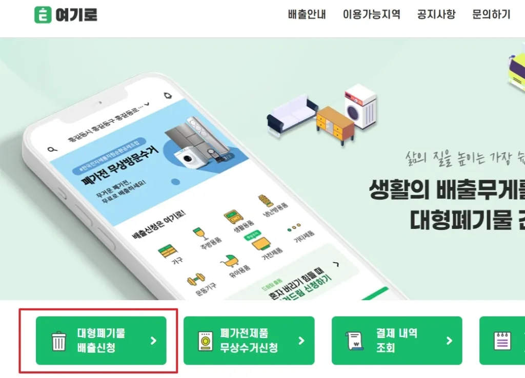 행전안전부와 일부 지자체 관할 구청과 업무 협약을 맺어 탄생한 대형폐기물 신고 앱 ‘여기로’입니다.